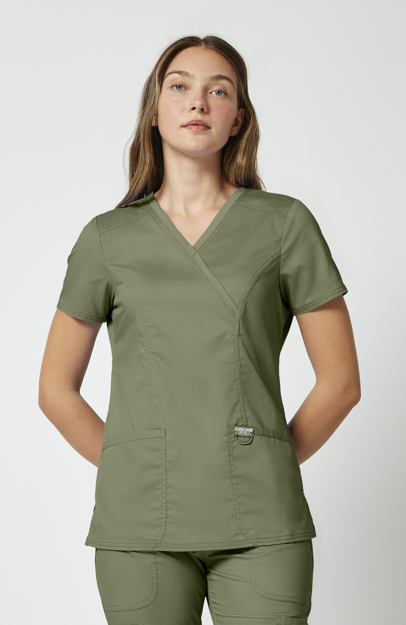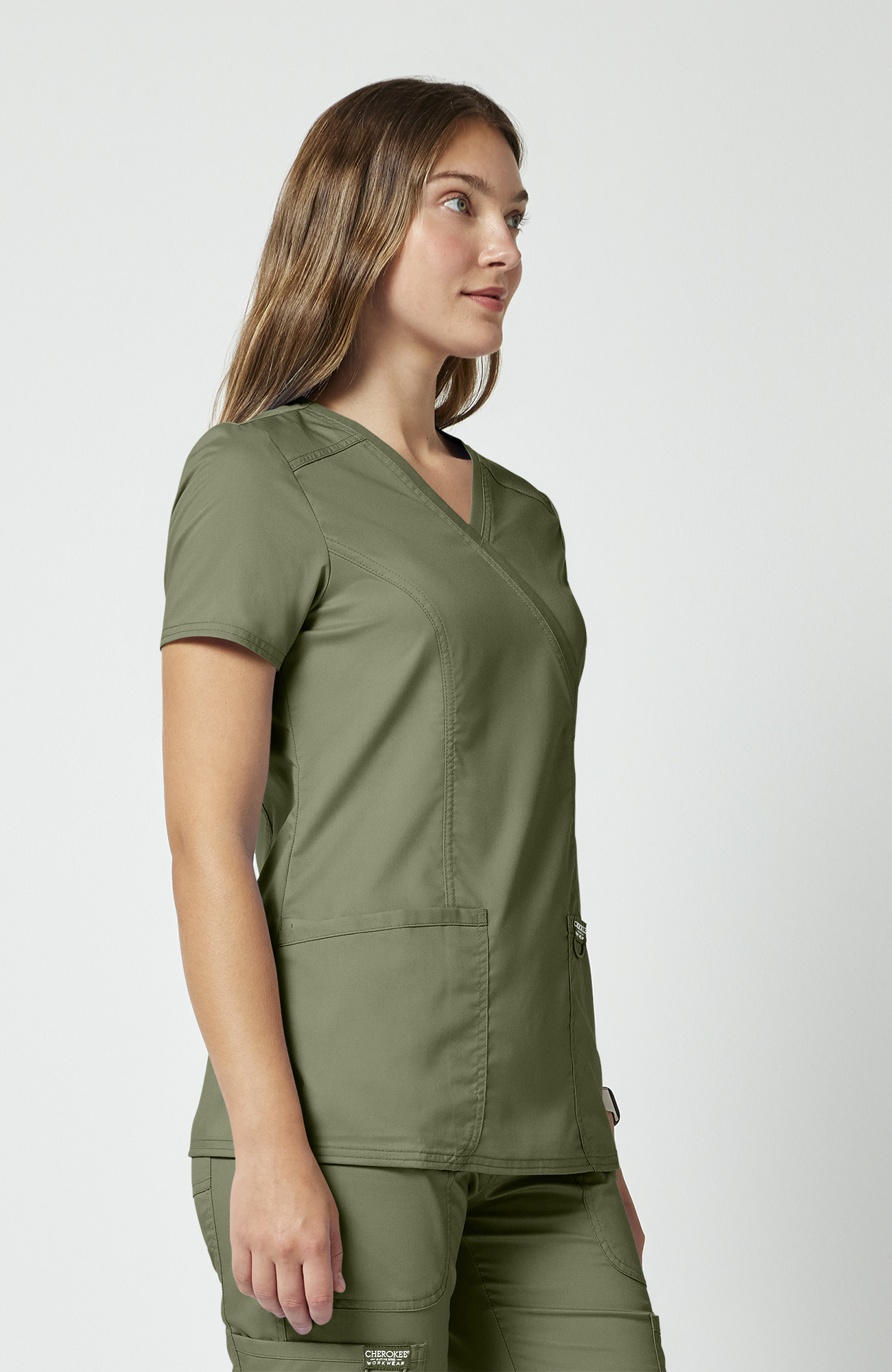 Blusa médica para mujer CK WW Revolution, ajuste Modern Classic, diseño mock wrap y 3 bolsillos.