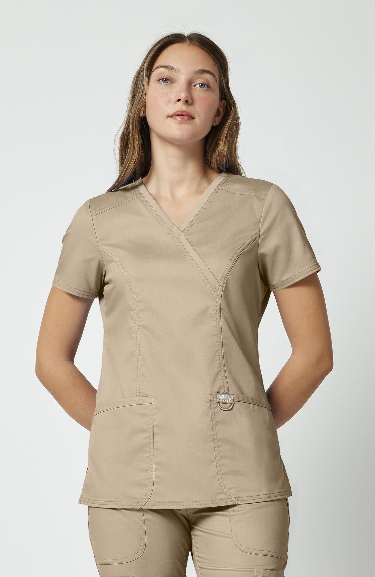Blusa médica para mujer CK WW Revolution, ajuste Modern Classic, diseño mock wrap y 3 bolsillos.