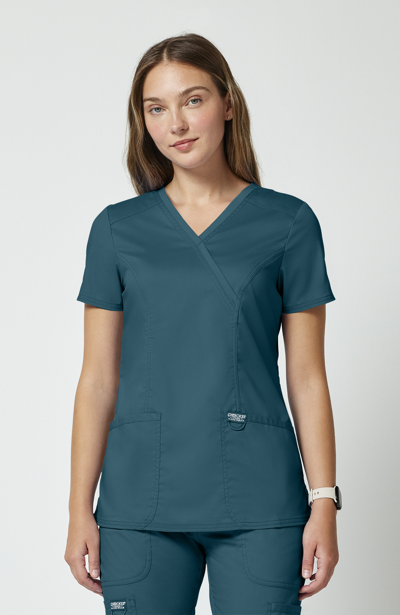 Blusa médica para mujer CK WW Revolution, ajuste Modern Classic, diseño mock wrap y 3 bolsillos.